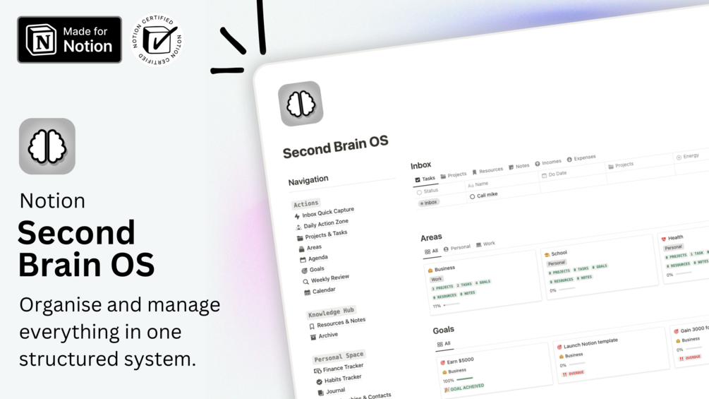 Level up your organisation with Notion Second Brain OS. Seamlessly manage tasks, finances, goals, and everything in between. Build your own digital brain now!